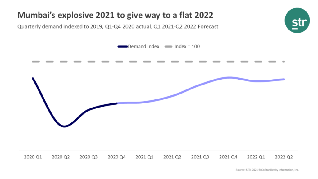 Hotels in India’s commercial capital of Mumbai, which has witnessed a rapid rebound post-Covid on the back of domestic demand, is projected to return to more moderate levels, as India battles a second Covid-19 wave, according to a recent market forecast from STR and Tourism Economics.