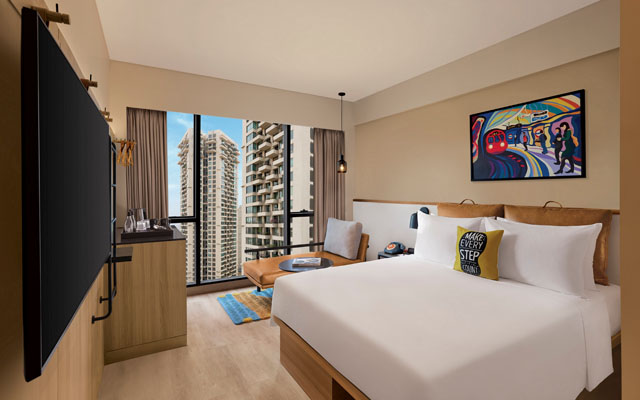 Nestled in the heart of Mumbai’s vibrant Andheri West, the 105-key Moxy Mumbai Andheri West is located nine kilometres from the Mumbai International Airport, and nearby cultural landmarks like Prithvi Theatre and Juhu beach.