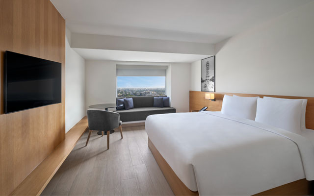 The hotel has 115 rooms featuring workspaces and high-speed Wi-Fi. Rooms offer views of the cityscape. Public areas have open layouts with natural light. Vista 20, the all-day dining restaurant on the 20th floor, serves international and local dishes with views of Jaipur. A bar is available for drinks.