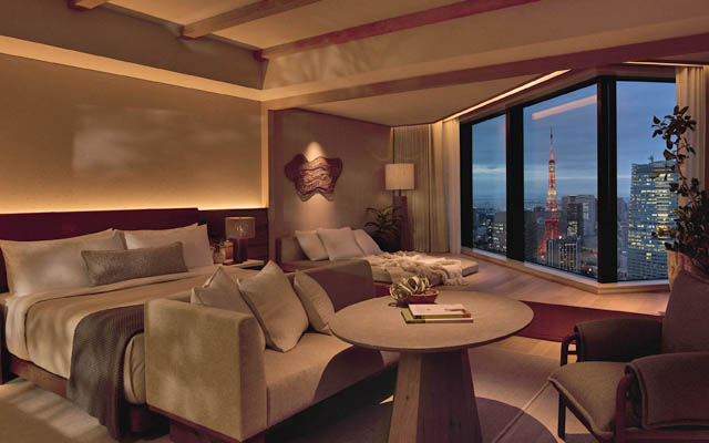 1 Hotel Tokyo in Akasaka occupies floors 38 to 43 of the Akasaka Trust Tower. The 211-room property includes 24 suites and three penthouses, with views of the Imperial Palace gardens and Tokyo Tower. Rooms use natural materials, local craftsmanship and plant elements.